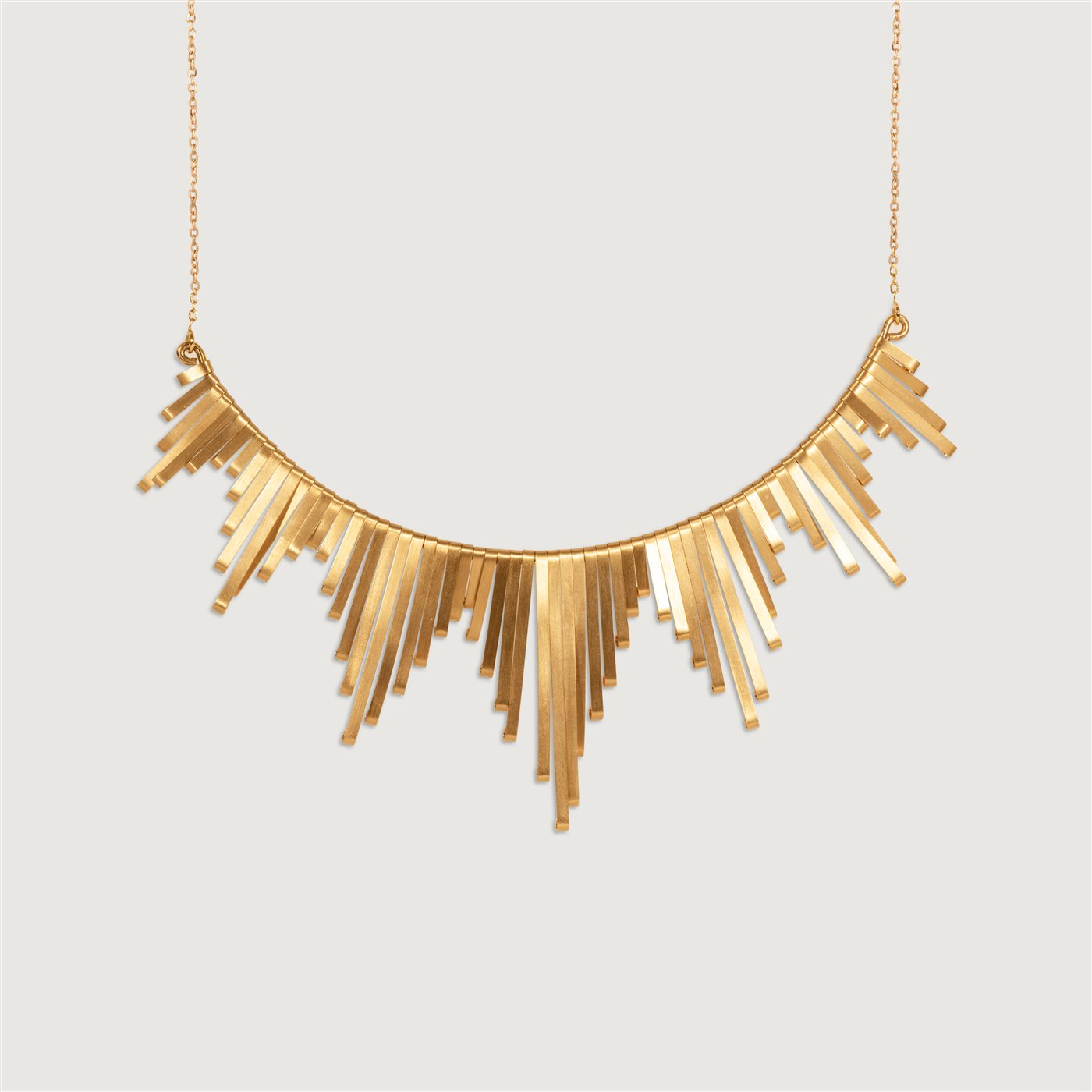 گردنبند طلا تابش بزرگ، درخشانترین محصول گالری طلا سنجاق. این گردنبند طلا، یکی از خاصترین و البته زیباترین گردنبندهای گالری سنجاق است که همانند نامش، تابان و چشم گیر است. طراحی این گردنبند طلا، به گونهای خاص و جذاب است که مثل اشعههای خورشید ساخته شده و درست همانند خورشید، درخشش منحصر به فردی دارد.