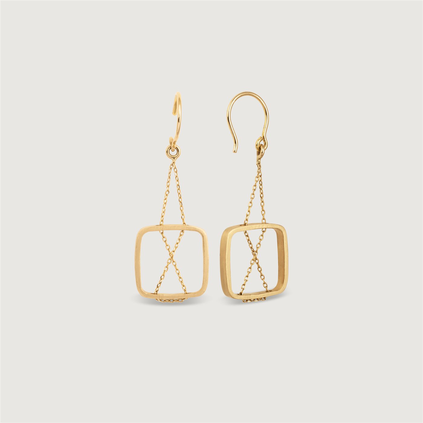گوشواره طلا مربع زنجیر، یکی از ظریفترین طراحیهای گالری سنجاق است که یکی از قدیمیترین محصولات این مجموعه به شمار میرود. طراحی این گوشواره به این صورت است که از یک قالب مربع شکل تو خالی ساخته شده که یک زنجیر به صورت مورب و ضربدری از آن رد شده و از بالای آن خارج شده که به سوزن گوشواره میرسد.